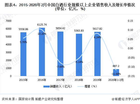 2015年以来,我国白酒行业规模以上企业销售收入呈总体下降趋势。2019年,全国规模以上白酒企业实现销售收入5617.82亿元,同比增长8.24%。2020年1-2月,受新型冠状肺炎疫情影响,行业规模以上企业实现销售收入887.2亿元,增速为-11.68%。