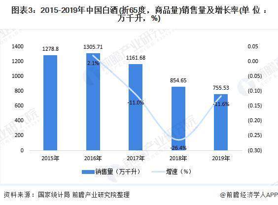从2015-2019年,我国白酒(折65度,商品量)的销量呈现U型态势,2016年为近5年的峰值达到1305.7万千升的销量;2018年,实现854.7万千升的销量,同比持续下降至-26.43%;2019年,白酒销量为755.53万千升,同比减少11.6%。可见,受“禁酒令”等政策环境的影响,我国白酒行业市场需求有所降低。