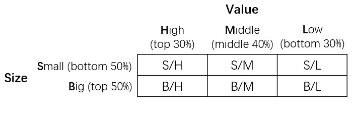 - 账面市值比的分组点都为第30个和第70个百分位数,前30%为低账面市值比组(L,Low),中间40%为中账面市值比组(N,neural),后30%为高账面市值比组(H,High)