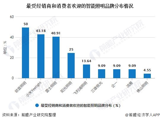 根据上海浦东智能照明联合会联合业内一线单位、企业共同编制发布《2019新渠道智能家居照明白皮书》中显示,目前中国主要的智能照明品牌有欧普照明、小米Yeelight、雷士照明、阳光照明、飞利浦照明等,在《2019新渠道智能家居照明白皮书》调研中,上述品牌在“最受经销商和消费者欢迎的智能照明品牌”选项中占比分别为50%、43.18%、40.91%、25%、13.64%。