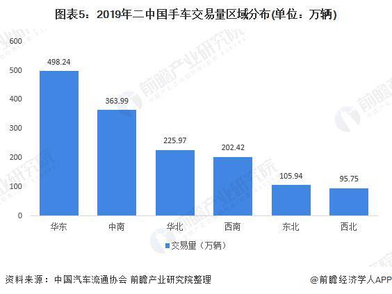 中国汽车流通协会发布的数据显示,2019年华东地区交易量达498.24万辆,占全国交易量的33.39%;中南地区的交易量达363.99万辆,占比达24.39%。