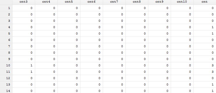 具体细节是这样的:co_c1到co_10共十个变量,需要统计每一行有多少个1。