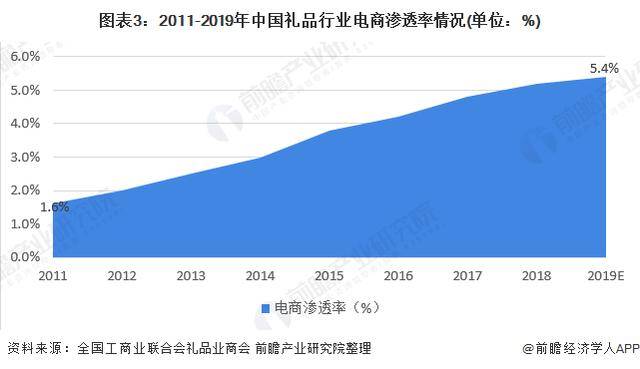 我国礼品行业电商渗透率总体呈逐年增长态势,2019年礼品行业电商交易渗透率提升至5.4%
