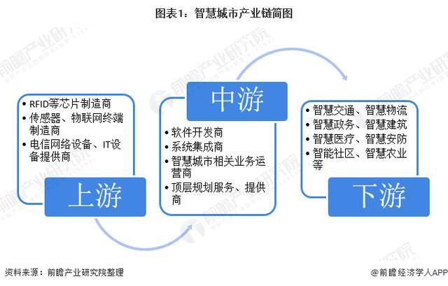 从产业链来看,智慧城市建设涉及的主体包括:政府、运营商、解决方案提供商、内容及业务提供商以及下游各应用领域等。从智慧城市解决方案来看,其产业链上下游涵盖了RFID等芯片制造商,传感器、物联网终端制造商,电信网络设备、IT设备提供商等;中游包括应用软件开发商、系统集成商、智慧城市相关业务运营商以及顶层规划服务提供商等多种科技型企业;下游应用领域包括智慧交通、智慧物流、智慧政务、智慧建筑等。