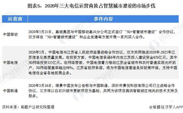 在上游运营商方面,运营商作为通信网络的建设和运营者,在物联网的建设方面具有较大优势,智慧城市也成为三大电信运营商抢夺的市场。2020年5月,嘉城集团与中国移动嘉兴分公司正式签订“5G+智慧城市建设”合作协议,双方将在“5G+智慧城市建设”和企业党建等方面开展一系列深入合作。与此同时,中国电信与江苏省人民政府签署战略合作协议,双方共同推进2020年-2025年江苏信息化高质量发展。2020年3月,绿景中国与中国联通、深圳市景悦科技有限公司订立战略合作协议,三方将以白石洲城市更新项目为基础,共同为该项目提供智能城区相关的技术支持及服务。