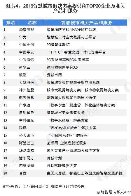 从智慧城市建设的上游来看,随着各领域领先企业陆续进入智慧城市建设领域,智慧城市解决方案提供商在各个领域发挥自身优势,竞争愈发激烈。2019《互联网周刊》与eNet研究院发布的“2019智慧城市解决方案提供商100强名单”,海康威视、华为、中国电信、中国平安、中兴通讯等入榜前二十榜单。
