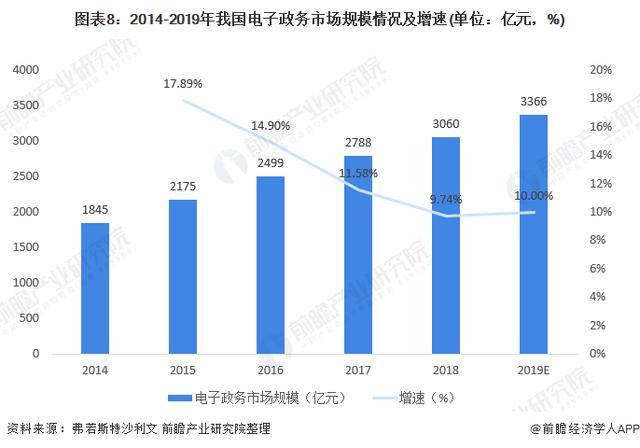 智慧政务方面,智慧政务在“智慧城市”的规划建设中,“智慧政府”是其中的一个重点领域,而电子政务是“智慧政府”的最直观体现。2014-2018年期间我国电子政务市场规模逐年扩张,年均复合增长率为13.48%。2018年电子政务市场规模为3060亿元,同比增长9.74%,初步估计2019年我国电子政务市场规模保持较高增速增长,市场规模近3366亿元。