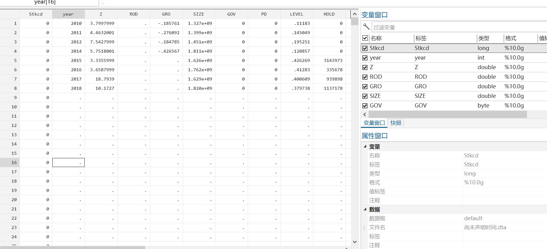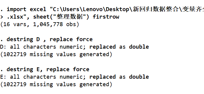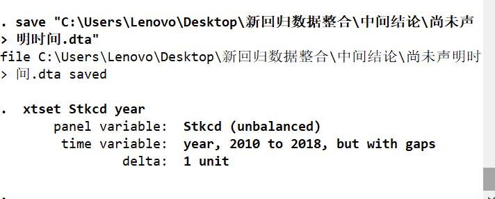 救助,我是用一个面板数据,导入EXCEL后,用destring 变量名 , replace force全部调为数值型,再用XTSET Stckcd year 声明时间序列,然后数据就只有最开头的一组(2010——2018)和最后一组l了,中间所有数据都变成了点点,这是咋回事呢。。