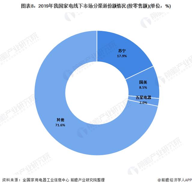 从线下销售渠道来看,作为我国线下两大重点流通渠道,苏宁和国美市场份额相对稳定。2019年苏宁以17.9%的份额位居市场首位,国美以8.5%的份额位居第二。