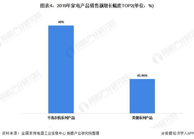 近年来,一些新兴家电,如洗碗机、美容仪、干洗衣机等产品受到市场追捧。2019年,干洗衣机系列产品销售额同比增长49%,在所有家电中排名第一;美健系列家电产品销售额同比增长45.96%,排名第二。