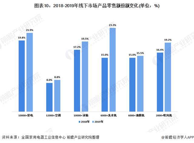 我国的家电消费已经进入了更新换代期,产品升级被企业和渠道广泛接受。随着消费者对高品质家电需求的增长,“以旧换新”活动也促使家电产品的更新换代,逐渐向高端化和智能化的方向发展。2019年,我国均价1000元以上的彩电和冰箱、12000元以上的空调、6000元以上的洗衣机线下市场零售额都有所扩大。