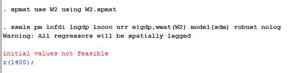 我想请教一个问题,就是在做面板空间计量的时候,已经生成spmat文件,但是操作xsmle命令时,出现下面的问题,请问是怎么回事,如何解决呢?感谢