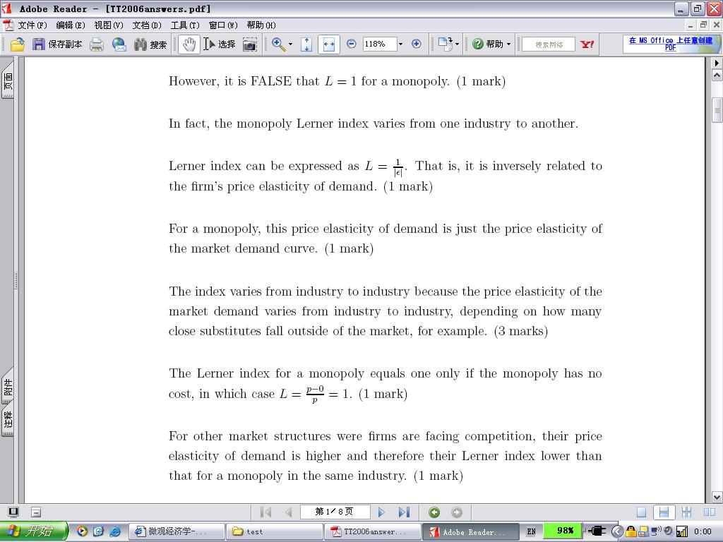 事实上我们发现,如果MC等于0,勒纳指数是无法反映垄断程度的,因为在此情况下,无论完全垄断、一般垄断、寡头、垄断竞争,直到完全竞争,该指数,如果还能够存在,全都是1