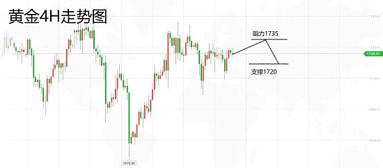 黄金昨日亚欧盘震荡下行,最低触及1712上方后止跌,美盘借助消息面的影响走高,吞没所有跌幅,日线收出长下影线的十字星,尾盘高位震荡,现报1726附近。