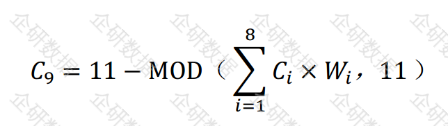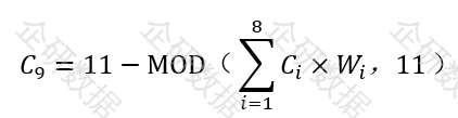 ($i = 1,2,...,17 $;$ C_i $为前17位数,字符对应的值已约定;$W_i$位为第 $ i $ 位上的加权因子,该加权因子同样已约定)