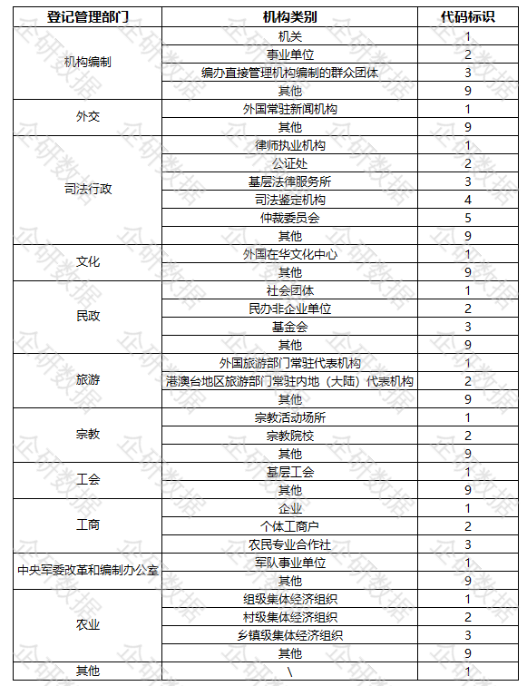 登记管理部门根据管理职能,确定在本部门登记的机构类别编码