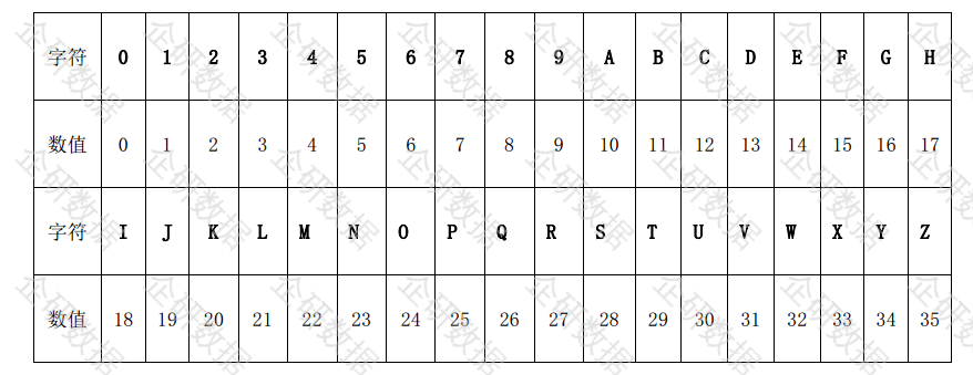 式中: MOD——求余函数; $ i $——表示代码字符从左至右位置序号;$C_i$——表示第 $i$ 位置上的代码字符的值,采用下方“代码字符集”所列字符;