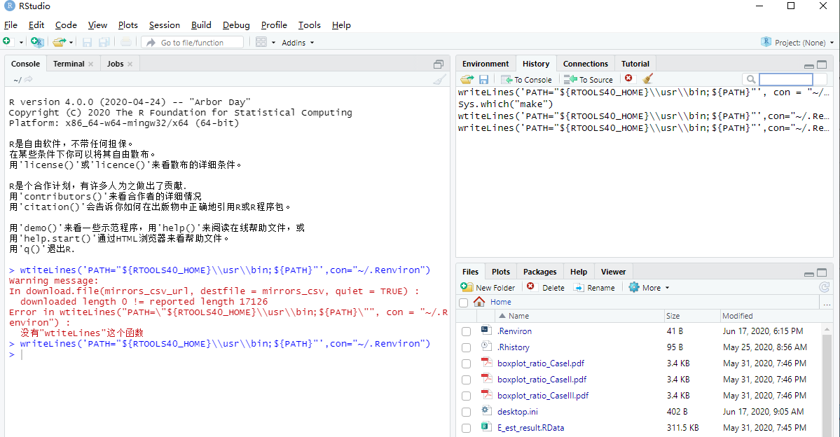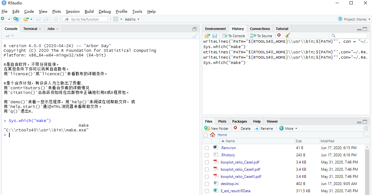 如果想返回而且这个语句设定的R 环境文件 /.Renviron 文件在Rstudio 默认路径,检查是否可以使用编译器,上一个语句输入后退出Rstudio 再次打开。如果没设定其他路径是的默认路径,如果和我一样,可以这样先输入默认路径,可以右边File 哪里看到 .Renviron 文件的存在 ,输入检查命令;