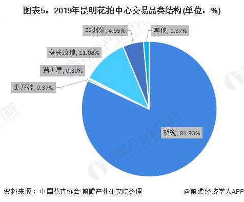 云南是我国当之无愧的鲜切花生产大省。除了鲜切花这一当家产品,经过多年发展,以鲜切花、种用花卉、地方特色花卉、绿化观赏苗木和加工用花卉为主的多元化产业发展格局基本形成。2019年,云南花卉种植总面积175.6万亩,同比增长2.5%;花卉总产值751.4亿元,同比增长42.9%,增幅是上年度的9.5倍,创近10年最大增幅。其中鲜切花种植面积25万亩,同比增长10.1%;产量139亿支,同比增长23.9%;产值120亿元,同比增长19.3%。2019年云南花卉生产面积、产品质量、单产均有较大提升。鲜切花从2018年的4.64万支/亩提升到5.58万支/亩,单产增长20%。2019年,昆明花拍中心成交量和交易额均有所上升,品种以玫瑰为主,占比81.93%。
