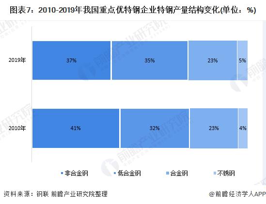 近几年来,我国全面实施“中国制造2025”,启动创建了“中国制造2025”的国家级示范区,持续推进制造业创新中心建设。高端制造业的发展激发了高端特钢产品的研发生产,从2010-2019年我国特钢产品结构可以看出,以低端产品为主的非合金钢产量占比有所下降,而不锈钢等中高端特钢产量占比小幅上升。