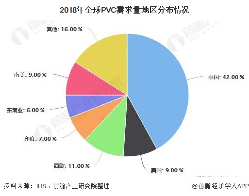 中国地区为PVC主要消费市场。2018年,中国地区PVC需求量为1898万吨左右,占全球PVC需求量的42%。