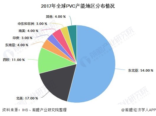 全球PVC产能主要集中在东北亚地区,其中中国地区就拥有全球PVC四成左右产能。根据IHS数据显示,2017年,全球PVC产能为5400万吨左右,其中东北亚地区PVC产能为2900万吨,占全球的54%。