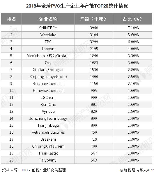 2018年,全球PVC年产能排名前三企业分别为日本信越化学(SHINTECH)、西湖化学(Westlake)和FPC,2018年PVC年产能分别为394.0万吨、310.4万吨和329.9万吨,分别占全球PVC产能的7.1%、5.6%和6.0%。