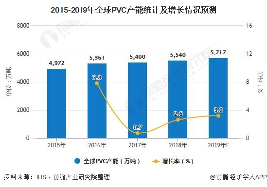 近年来,全球PVC产能持续增长。根据IHS数据显示,2018年,全球PVC产能为5540万吨,同比增长2.6%;初步测算2019年,全球PVC产能为5717万吨左右。