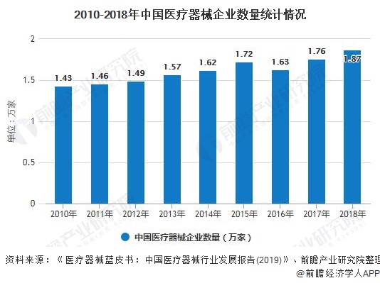 随着国家政策和下游需求的共同驱动,我国医疗器械行业的企业数量也呈总体增长态势。2018年,我国医疗器械行业企业数量达1.87万家,同比增加了1074家。