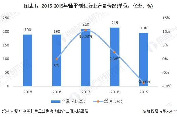 在供给端,2015-2016年,我国轴承制造行业产量基本保持不变,为190亿套。随着我国轴承制造行业逐渐适应我国经济结构调整的“新常态”,2017年我国轴承行业产量开始出现回暖,实现产量210亿套,同比增速达到10.53%。但是,2019年,受到下游汽车、机床等行业需求下降的影响,我国轴承行业产量出现下滑现象,产量为196亿套,同比下降8.83%。