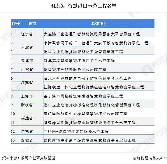 近年来,在“互联网+”大发展的背景下,我国港口建设也经历着数字化、自动化的转型升级。为推动智慧港口的建设和发展以及贯彻落实《交通运输信息化“十三五”发展规划》,交通部于2017年印发了《关于开展智慧港口示范工程的通知》,《通知》明确,将依托信息化,重点在港口智慧物流、危险货物安全管理等方面,选取一批港口开展智慧港口示范工程;同年,交通运输部公布了13家“智慧港口示范工程名单”,具体如下表所示: