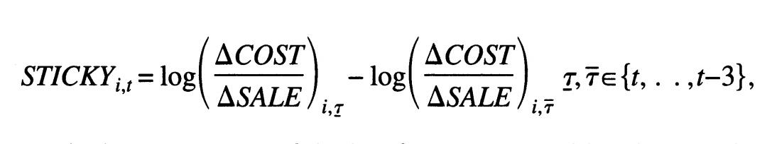 STICKY是指,在某一年份的第一季度至第四季度中,销售规模增长与减少情况下成本变动额的非对称性。如果成本是有粘性的,那意味着当销售额增加时成本增加额应比销售额下降相同幅度时成本的降低额要大,此时STICKY的值应为负,且越小,意味着成本粘性越大。与之相反,如果公司成本存在反粘性,那意味着当销售额增加时成本增加额比销售额下降相同幅度时成本的降低额要小,此时STICKY的值应为正,且越大,意味着成本反粘性越大。