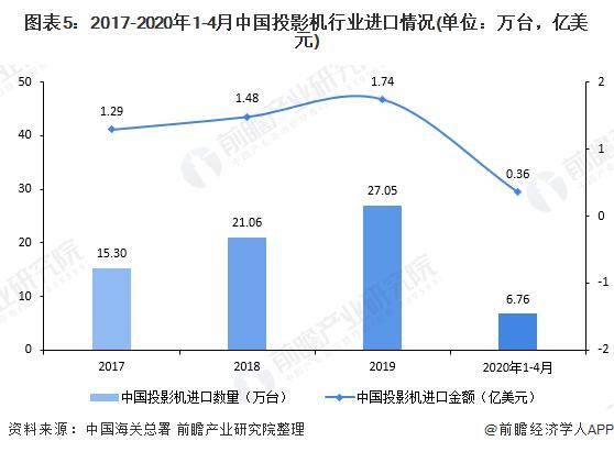 2020年1-4月,中国投影机进口数量为6.76万台,进口金额约为0.36亿美元。