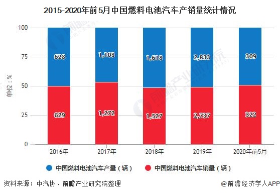 中国汽车工业协会发布的数据显示,2019年,我国燃料电池汽车产销分别完成2833辆和2737辆,同比分别增长85.5%和79.2%。从2016年到2019年,国内燃料电池汽车销量逐年增加。或受到疫情影响,截止至2020年1-5月中国燃料电池汽车产销分别完成309辆和322辆,同比分别下降44.1%和40.9%。
