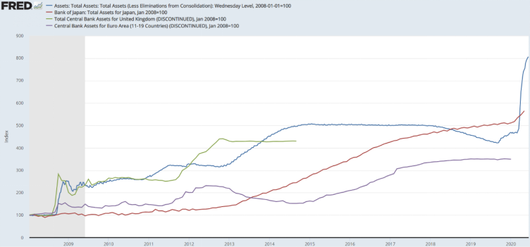 先贴一张图,是西方四大央行美联储、欧央行、日本央行和英格兰银行2008年初到现在的资产负债表增长情况。将2007年底的基数设置为100,就显示了金融危机以来,主要西方国家印钞规模增长的倍数。