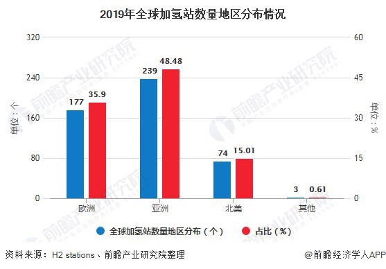3、截止2019年底全球加氢站数量达493座 亚洲占比近五成