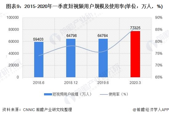 2020年初,受新冠肺炎疫情影响,网络视频应用的用户规模、使用时长均有较大幅度提升。截至2020年3月,我国网络视频(含短视频)用户规模达8.50亿,较2018年底增长1.26亿,占网民整体的94.1%。其中短视频用户规模为7.73亿,较2018年底增长1.25亿,占网民整体的85.6%。