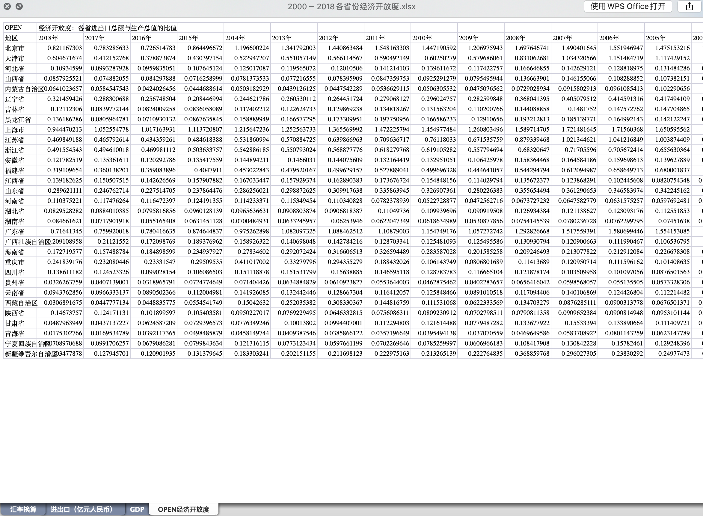 经济开放度:各省进出口总额与生产总值的比值。数据来自中国统计年鉴,16年以前的数据已按年末汇率调整统一了口径和单位。预览见下图。