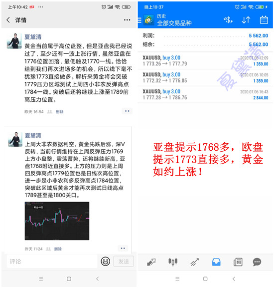 周一亚盘提醒黄金回撤1768多,欧盘提醒1773直接多,并且明确给出黄金多单目标,后续行情如约上涨,恭喜跟上操作的朋友!