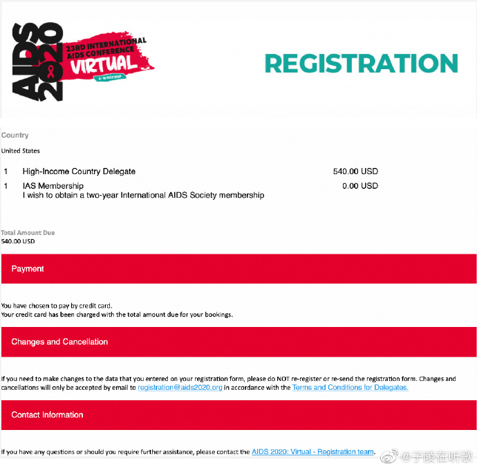 子陵在听歌:我今天一天的最大成就,就是花了12个小时注册了AIDS 2020会议。虽然这个原定于在旧金山举办的会议变成了视频会议,且注册费分毫不减,但注册网站依然被挤爆宕机。今天不停刷屏终于在不久前刷出来了。之所以这样爆满,是因为这次大会除了HIV/AIDS,一如今年另一个艾滋病年会CROI,AIDS 2020增加了大型COVID-19专场。