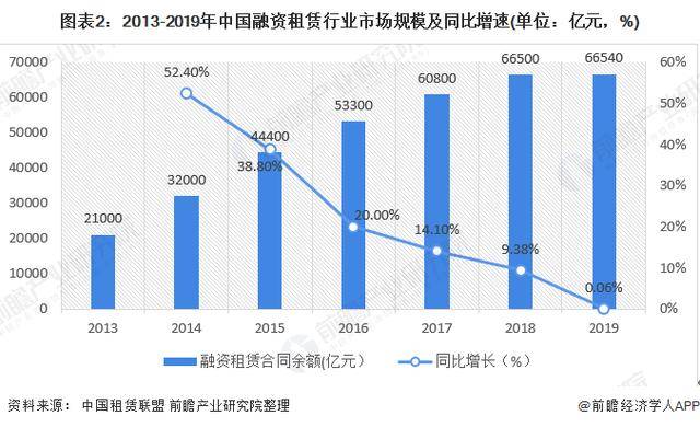 2013-2019年期间我国融资租赁行业市场规模总体呈波动增长态势。据中国租赁联盟数据,截至2019年12月底,全国融资租赁合同余额约为66540亿元,比2018年底的66500亿元增加约40亿元。