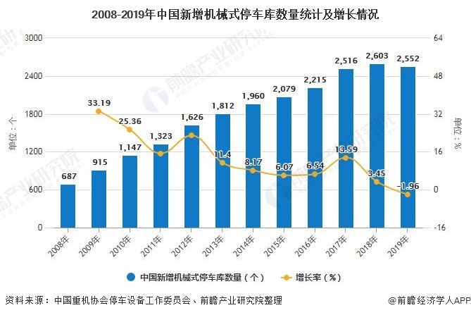根据中国重机协会停车设备工作委员会发布的数据,2019年,全国共有新增机械式停车库2552个,较2018年略有下降,机械式停车库增速趋缓,新增机械停车位893476个,同比增长了3.24%,同比增长率较2018年略有下滑,但整体新增机械停车位数量仍在不断地增长。