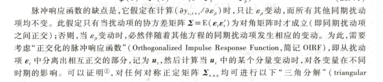 看到书上写“SCAR模型中可以得到正交化的脉冲响应函数,即可以单独考虑各个变量的冲击对其他变量的影响。”难道一般的脉冲响应函数不是这个意思吗?很迷惑,希望高手指点!