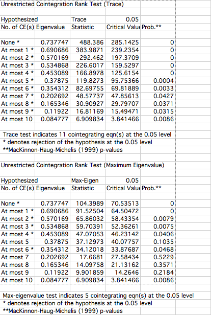 首先从图中看出迹统计量和最大特征值统计量的结果不一致,前者显示存在10个协整关系,后者存在5个协整关系。另外一个问题是你选取了这么多的解释变量对模型的结果有很大的影响,所以建议重新慎重的选择解释变量