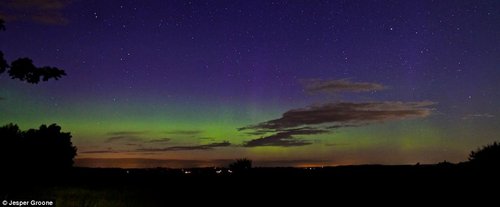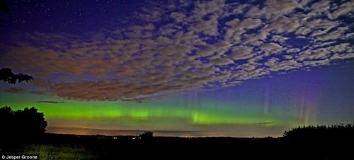 位于地平线上的北极光,丹麦与苏格兰具有相同的磁场纬度