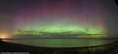 美国密歇根州苏必利尔湖畔拍摄到的北极光