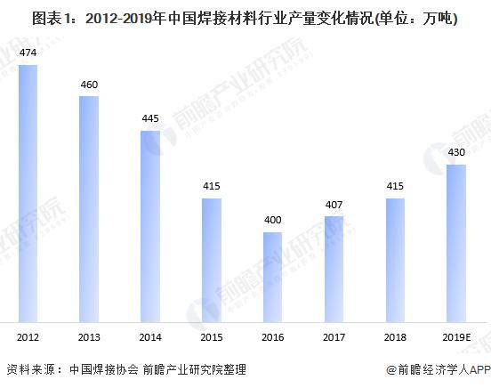 根据中国焊接协会发布的《北京·埃森焊接与切割展览会展会综合技术报告》披露的数据,2012-2018年,我国焊接材料总产量呈现波动变化态势,产量维持在400-500万吨之间,焊接材料行业由高速发展转变为高质量发展,产品结构逐步趋向于合理。初步估计2019年,我国焊接材料产量或达到430万吨。