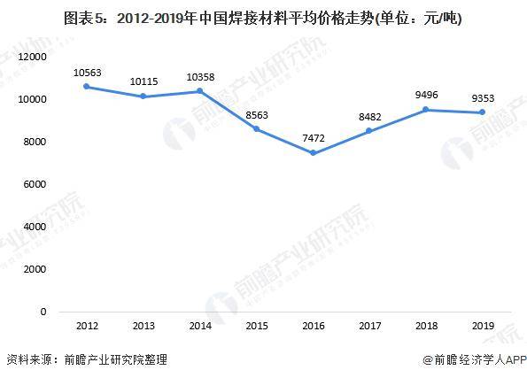 近年来,受行业整体转型升级影响,我国焊接材料价格呈现先下降后增长的态势,高端焊接材料由于技术被越来越多的厂家掌握,相关价格也有所下滑。2019年,我国焊接材料平均价格在9353元/吨左右,与2018年基本持平,整体价位较为稳定。