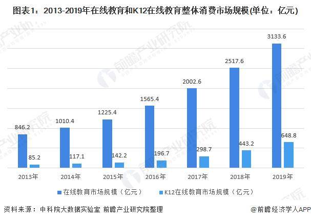 K12在线教育是伴随着互联网技术和信息科技的发展,一种明显区隔于传统线下教育的、传播知识内容的新型学习方式。近年来,在我国ZF的大力支持和互联网技术日益进步的前提下,K12在线教育的市场规模也在不断扩大,2019年在线教育和K12在线教育市场规模分别达到3133.6亿元和648.8亿元。根据中国科学院大