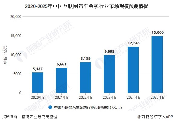 相较于互联网汽车金融,传统车贷审批速度相对较慢、审核资料较为繁琐、首付较高。汽车金融专业具有专业服务,能提供专业解决方案,具有一定的灵活性,前瞻分析认为,未来银行、电商和汽车金融专业服务行业间公司融合发展是将是行业未来发展的主要趋势。前瞻预计到2025年,我国互联网+汽车金融将超过15000亿元。